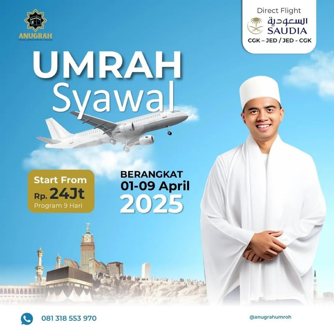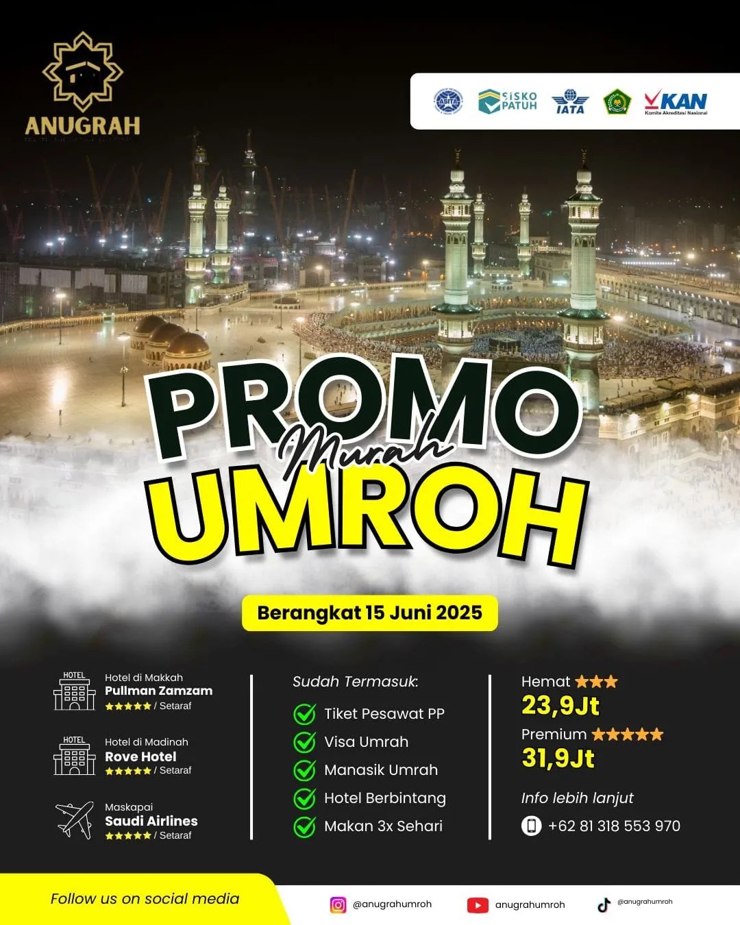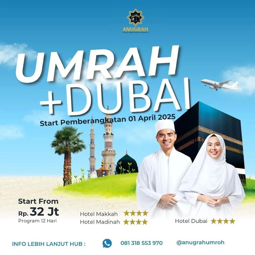 Nikmati kemudahan beribadah ke tanah suci dengan pelayanan Anugrah Travel mulai dari penerbitan visa, maskapai penerbangan, hingga akomodasi semuanya ada di Anugrah.